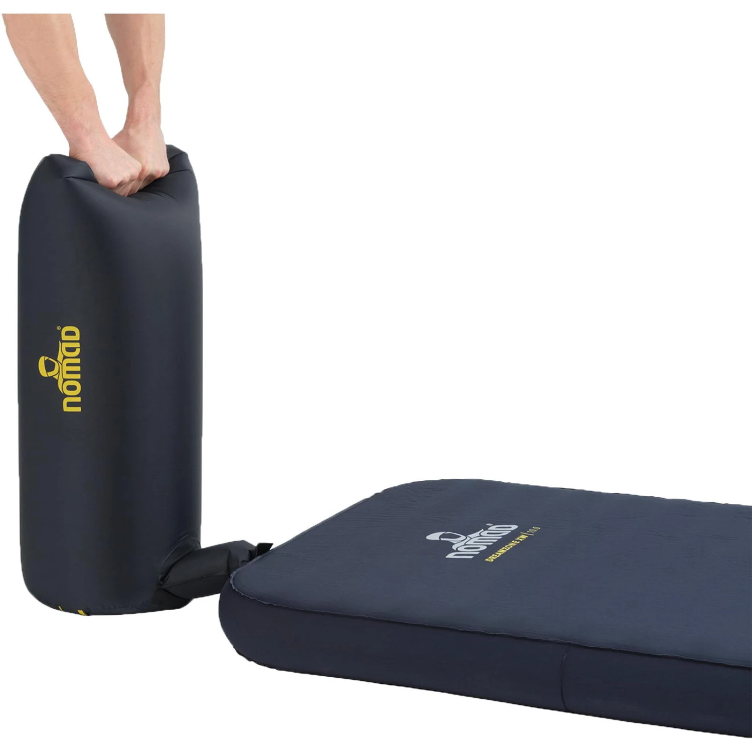 Die Dreamzone XW 10.0 von Nomad ist eine dicke, selbstaufblasende Isomatte aus der Dreamzone Schlafmattenserie von Nomad. Die komfortable Matte eignet sich besonders gut für den Urlaub im Auto oder Wohnmobil, kann aber natürlich auch zu Hause als Gästebett verwendet werden. Diese extrabreite Variante der Dreamzone 10.0 ist 8 cm breiter und bietet so zusätzlichen Schlafkomfort. Dank der steilen Seitenwände und der raffinierten 3D-Konstruktion kann man auf der gesamten Liegefläche schlafen und so die Breite optimal nutzen. Außerdem kann eine zweite Schlafmatte für ein randloses Schlaferlebnis einfach daneben gelegt werden. Das dehnbare Oberflächengewebe sorgt für optimalen Halt und der Schaumstoff im Inneren der Matte sorgt für zusätzlichen Komfort und eine hervorragende Isolierung. Der Schaumstoff ist antibakteriell behandelt, um Geruchs- und Schimmelbildung zu verhindern. Das große, robuste Ventil hat mehrere Positionen, darunter eine 1-Wege-Funktion zum einfachen Aufblasen und Entleeren der Matte. Die mitgelieferte Aufbewahrungstasche kann auch als Pumpsack verwendet werden, um die Matte noch schneller und hygienischer aufzublasen. Zum Lieferumfang gehört auch ein Reparaturset, mit dem die Lebensdauer der Matte verlängert werden kann.