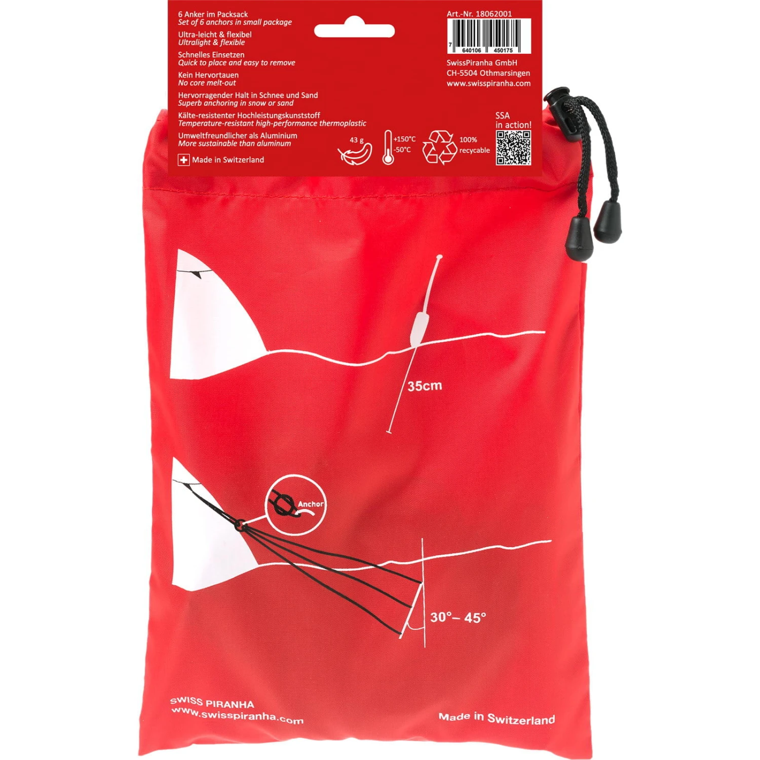 Der innovative Schnee & Sand Anker von SwissPiranha ermöglicht in weichen Untergründen, wie Sand oder Schnee, eine schnelle und hervorragende Verankerung mit hoher Ausreißfestigkeit. Der ultraleichte Schnee- und Sank-Anker besteht aus robustem, hochflexiblem Hochleistungskunststoff PiranhaXT. Der kälte-resistente Kunststoff bleibt auch bei niedrigen Temperaturen (-50°C) elastisch und verhindert ein „Hervortauen“ aus dem Schnee. Die Herstellung liegt in der Schweiz und der PiranhaXT-Kunststoff benötigt zudem bis zu 13-mal weniger Energie als herkömmliche Metall- oder Aluminiumanker. So funktioniert er: Mit einer Schaufel ein “T” in die Oberfläche stechen, den Schnee- und Sank-Anker im Winkel von 30 bis 45° hineinstecken und anschließend durch flaches Schlagen mit der Schaufel die Oberfläche festigen. Es wird ein Set von 6 Stück inkl. praktischem Packsack mit aufgedruckter Gebrauchsanleitung geliefert.
