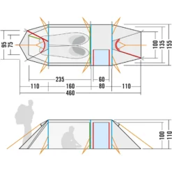 Merkmale: Tunnelzelt mit drei GestĂ€ngebögen und Apside; Himmeltasche; Herausnehmbare Tasche in der Apside; Seitlicher Eingang in die Apside mit separat verschlieĂbarem Moskitonetz; Drei EingĂ€nge in das AuĂenzelt; Zwei LĂŒfter im AuĂenzelt; Wasserdicht versiegelte NĂ€hte; Wasserdichte Verarbeitung der Abdeckungen, LĂŒfter und Ansatzpunkte; Reflektierende Zeltleinen; Praktische Packhilfe fĂŒr Zeltleinen; VerstĂ€rkte Eckpunkte mit Gurtbandschlaufen; Extra langes Innenzelt (235 cm) fĂŒr mehr Liegekomfort; Zwei EingĂ€nge in das Innenzelt, einer davon mit separat verschlieĂbarem Moskitofenster; Zwei Einstecktaschen im Innenzelt neben dem Eingang; Bequeme Einstecktasche in Greifhöhe am FuĂende; WĂ€scheleine im Innenzelt; LĂŒfter im Innenzelt; Eloxiertes Aluminium-ZeltgestĂ€nge; Inklusive PacksĂ€cke fĂŒr Zelt und GestĂ€nge