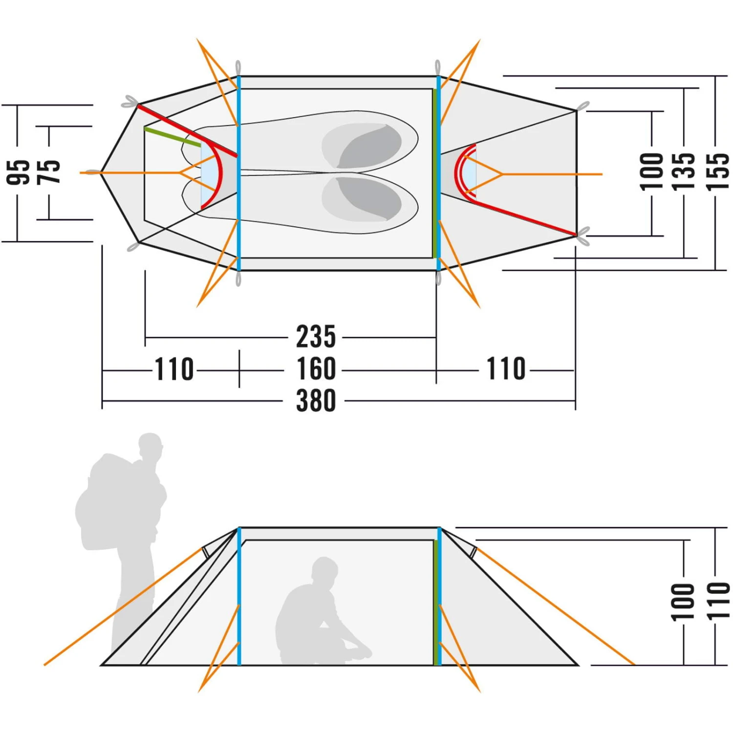 Merkmale: Tunnelzelt mit zwei GestĂ€ngebögen; Apside mit Fronteingang; Zwei EingĂ€nge in das AuĂenzelt; Zwei LĂŒfter im AuĂenzelt; Wasserdicht versiegelte NĂ€hte; Wasserdichte Verarbeitung der Abdeckungen, LĂŒfter und Ansatzpunkte; Reflektierende Zeltleinen; Praktische Packhilfe fĂŒr Zeltleinen; VerstĂ€rkte Eckpunkte mit Gurtbandschlaufen; Extra langes Innenzelt (235 cm) fĂŒr mehr Liegekomfort; Zwei EingĂ€nge in das Innenzelt, einer davon mit separat verschlieĂbarem Moskitofenster; Zwei Einstecktaschen im Innenzelt neben dem Eingang; Bequeme Einstecktasche in Greifhöhe am FuĂende; WĂ€scheleine im Innenzelt; Eloxiertes Aluminium-ZeltgestĂ€nge; Inklusive PacksĂ€cke fĂŒr Zelt und GestĂ€nge