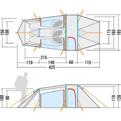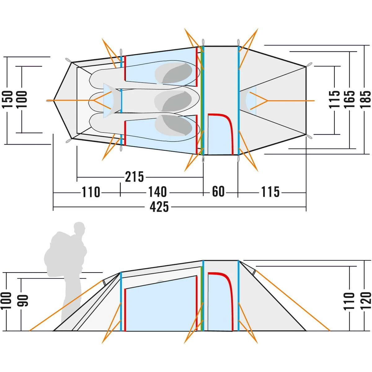 Tunnelzelt mit drei GestĂ€ngebögen; Apside mit Seiteneingang; SeitenwĂ€nde des AuĂenzeltes zum Hochrollen; Zwei LĂŒfter im AuĂenzelt; Wasserdicht versiegelte NĂ€hte; Wasserdichte Verarbeitung der Abdeckungen, LĂŒfter und Ansatzpunkte; Reflektoren an den Zeltleinen; Praktische Packhilfe fĂŒr Zeltleinen; VerstĂ€rkte Eckpunkte mit Gurtbandschlaufen; Innenzelt komplett aus Moskitonetz; Zwei Einstecktaschen im Innenzelt neben dem Eingang; Bequeme Einstecktasche in Greifhöhe am FuĂende; WĂ€scheleine im Innenzelt; Eloxiertes Aluminium-ZeltgestĂ€nge; Inklusive PacksĂ€cke fĂŒr Zelt und GestĂ€nge