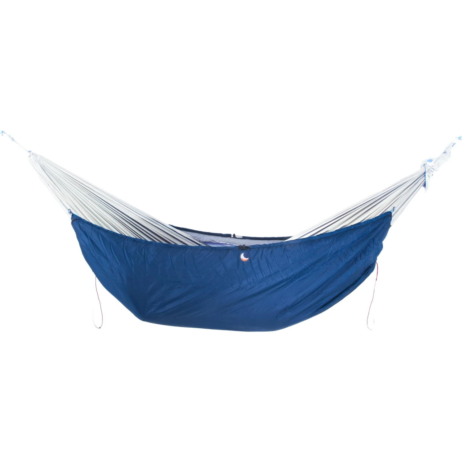Der Moonquilt von Ticket on the Moon hĂ€lt den RĂŒcken und deine Beine warm, wĂ€hrend man sich in der HĂ€ngematte frei bewegen kann. Bei windigem Wetter kann man den synthetischen Drei-Jahreszeiten-Underquilt mit dem ReiĂverschluss schlieĂen, so dass er einen selbst und die HĂ€ngematte vollstĂ€ndig umhĂŒllen. Mit den zwei ReiĂverschlĂŒssen und den verstellbaren Gummikordeln kann man den Grad der Isolierung bequem von der HĂ€ngematte aus einstellen. Das Packen ist mit dem intelligenten Kompressionsbeutel, der neben dem Moonquilt, auch eine HĂ€ngematte, ein Moskitonetz und die AufhĂ€ngungen fasst, ein Kinderspiel – so kann man das System in weniger als einer Minute, in einem Rutsch, auf- und abbauen (Tarp, Moskitonetz, etc. als Zubehör erhĂ€ltlich). Kleine Taschen an den Ecken sorgen dafĂŒr, dass Kordeln und Minikarabiner ordentlich verstaut sind, wenn man den Moonquilt als Schlafsack oder Decke, verwenden möchte.